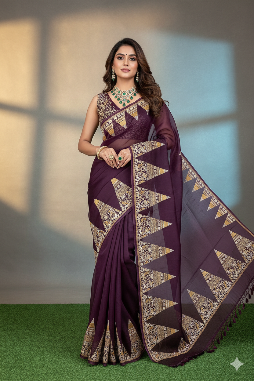 Deep Purple Organza Printed Saree With Pita Zari Border, With Unstiched Blouse