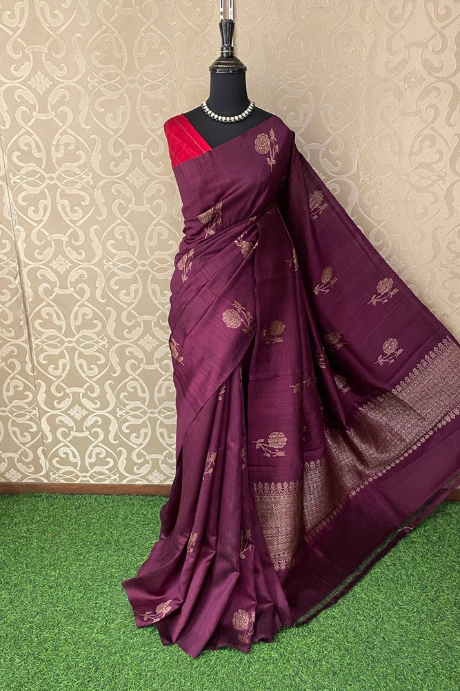 Deep Purple Pure Raw Tussar Banarasi Silk Saree, Hand Woven Motifs With Unstiched Blouse