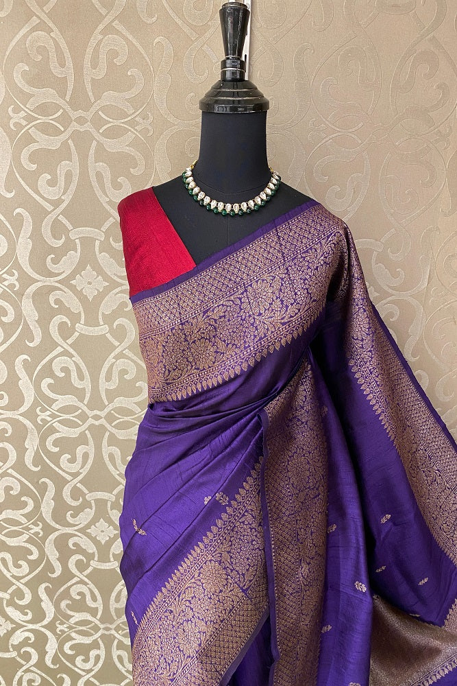 Deep Purple Pure Raw Tussar Banarasi Silk Saree, Hand Woven Motifs With Unstiched Blouse