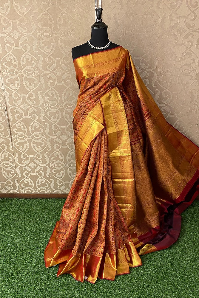 Golden Red Pure Kanjeevaram Silk Saree, With Unstiched Blouse