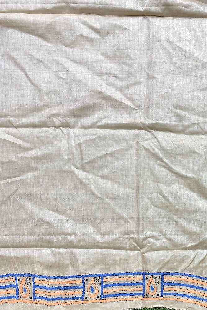 Offwhite Blue Tussar Embroidery Saree With Kantha Work Border, With Unstitched Blouse