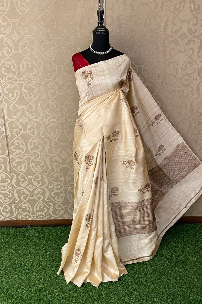 Offwhite Pure Raw Tussar Banarasi Silk Saree With Zari Work, With Unstich Blouse