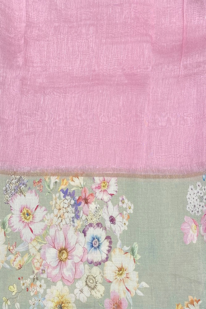 Pastel Green Floral Printed Linen Silk Embroidery Saree, With Unstiched Blouse