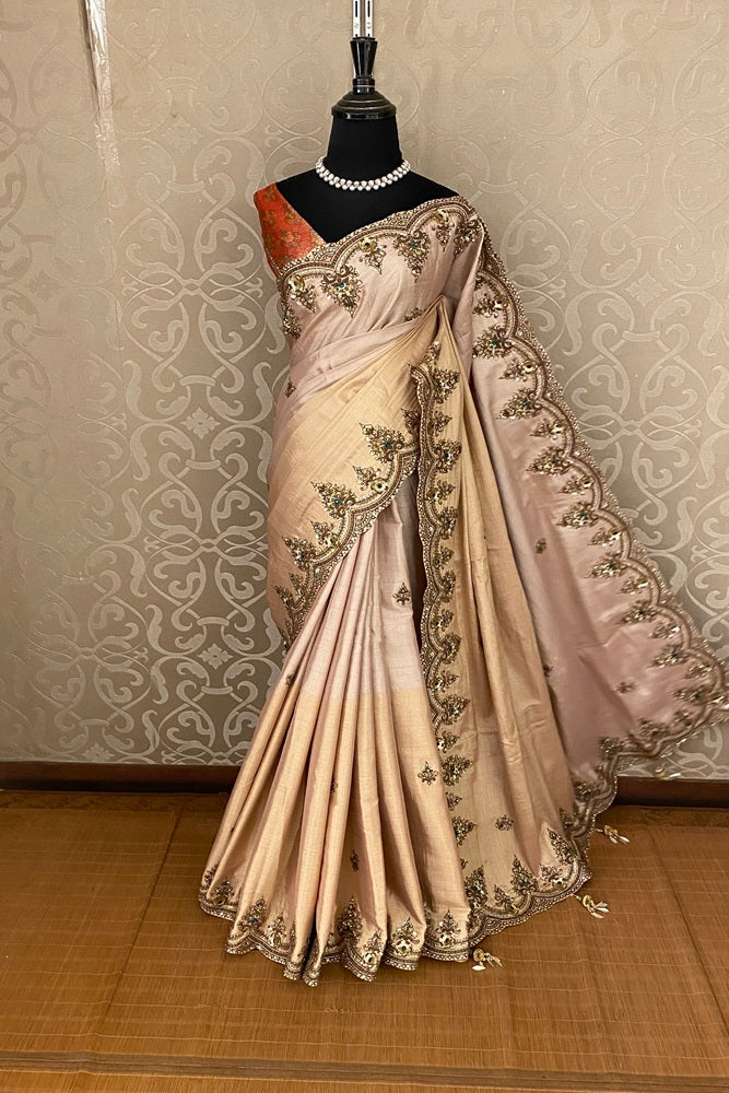 Peaches Gold Pure Soft Tissue Silk Embroidery Saree, With Unstiched Blouse