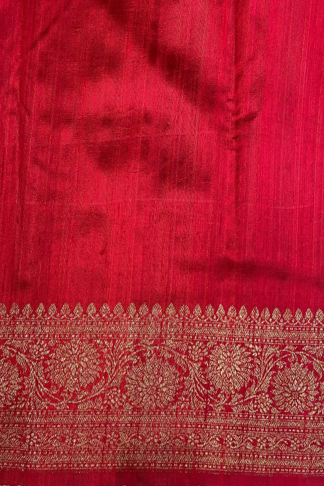 A Pure Raw Tussar Banarasi Silk Saree Is A Luxurious Handwoven Garment Known For Its Unique Blend Of Rustic Texture And The Regal Elegance Of Traditional Banarasi Craftsmanship, Making It A Timeless Classic.